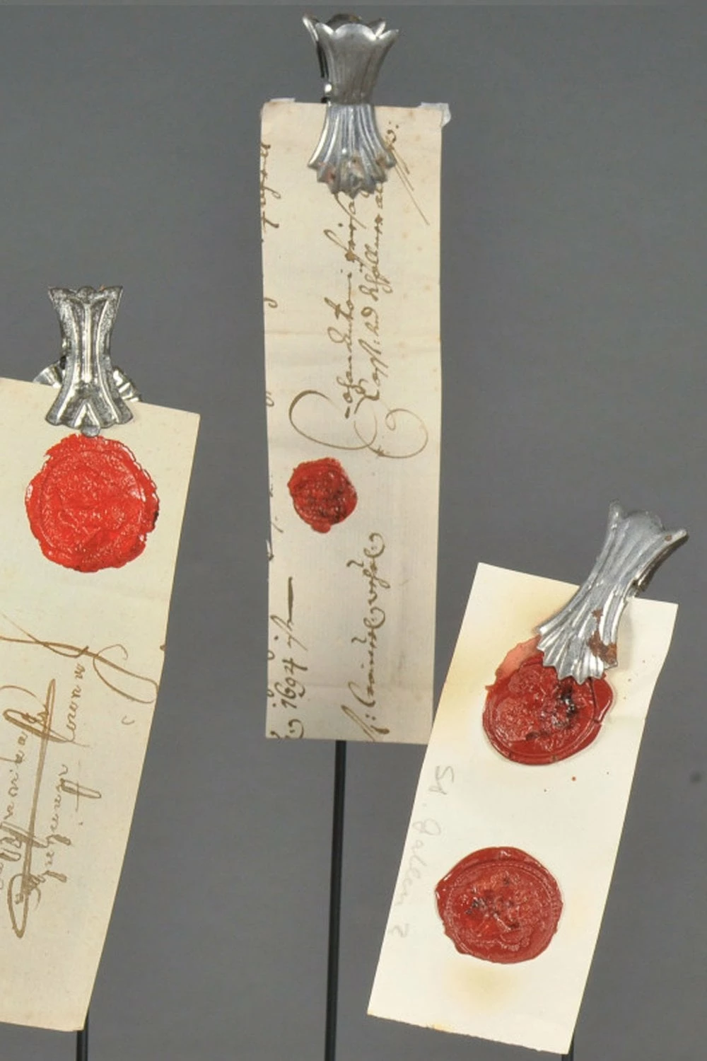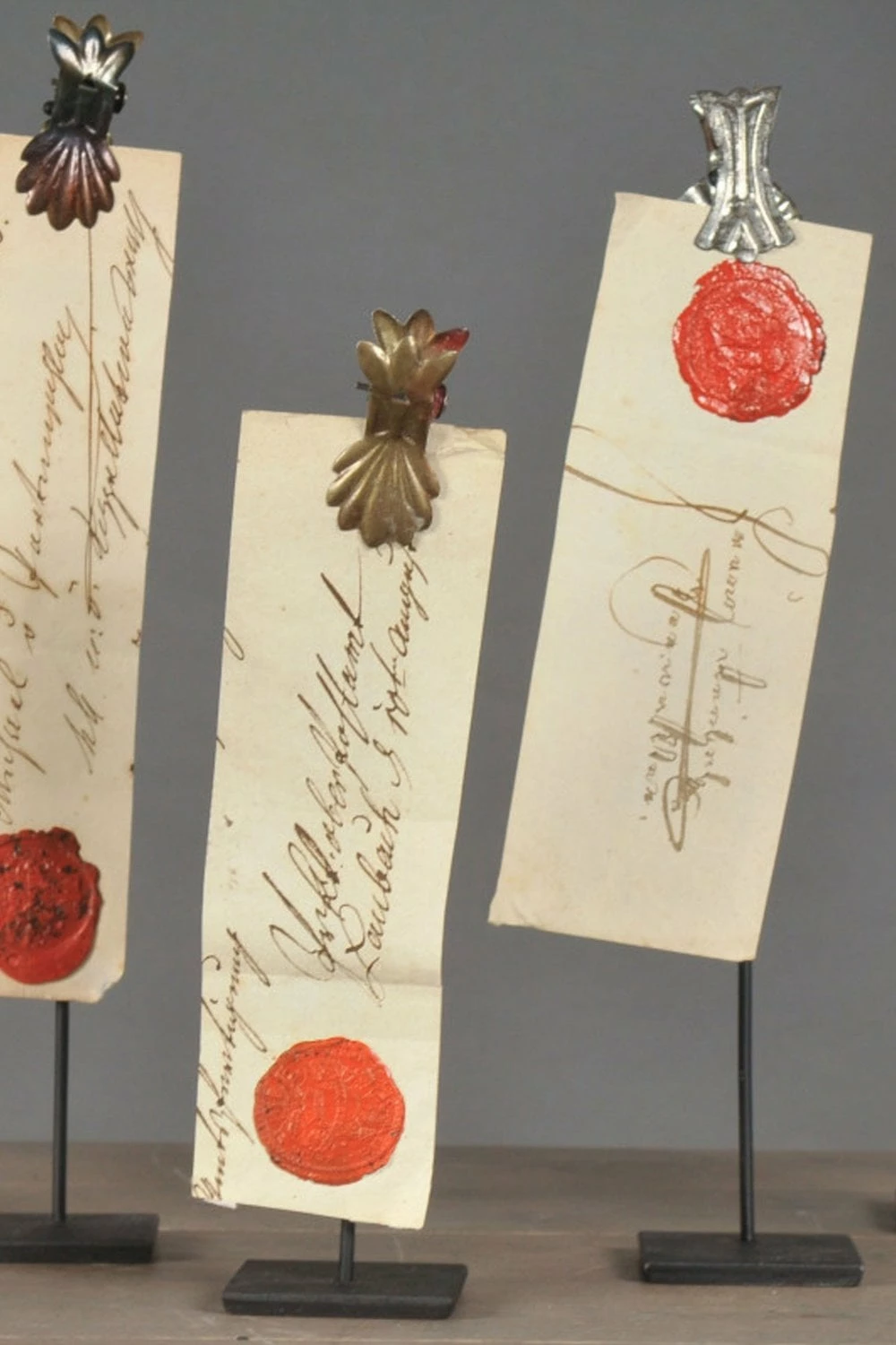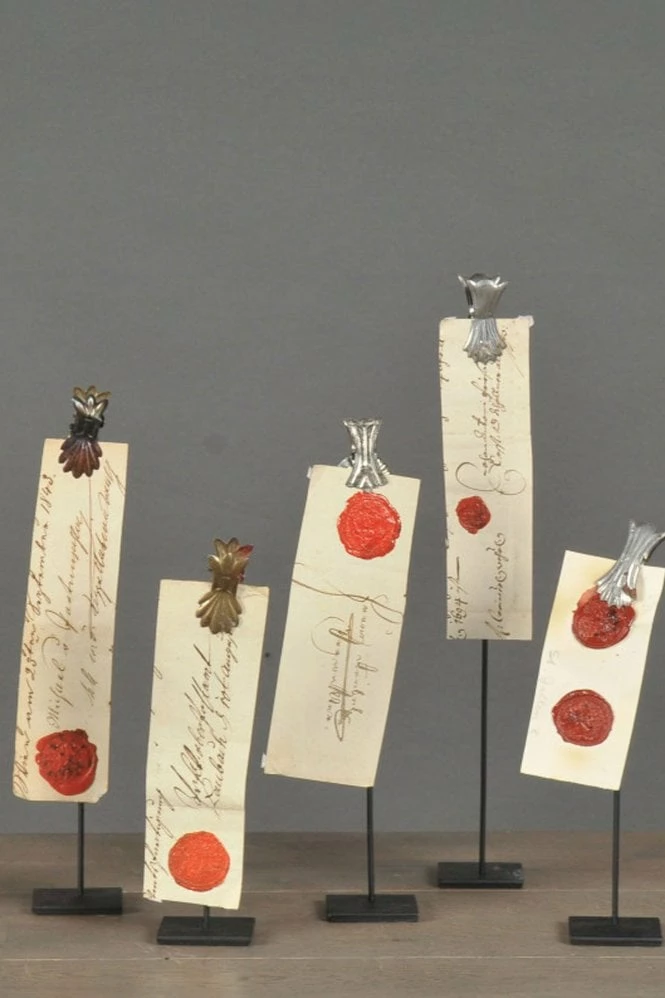 Old seal on a single pinch base Handwritten page with their original wax seal Reproduction pages and seals dating from the 17th to 19th century Pages attached are taken from notary public’s notes or other handwritten documents Clipped onto a black matte metal stand One seal and pinch base Each piece is unique and vary in size and style Please see photograph for a selection of different styles H 30 to H 20 x 4 x 4 cm 39377