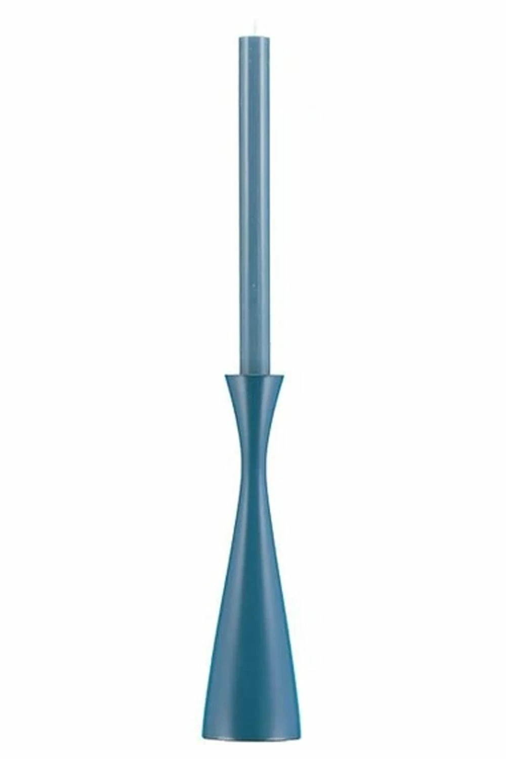 Candle holder Petrol Blue Wood Pad on candlestick base Metal cup to fit dinner or taper candles Handmade in India Large: 25cm x 6.6cm Small: 15cm x 6cm Wipe clean