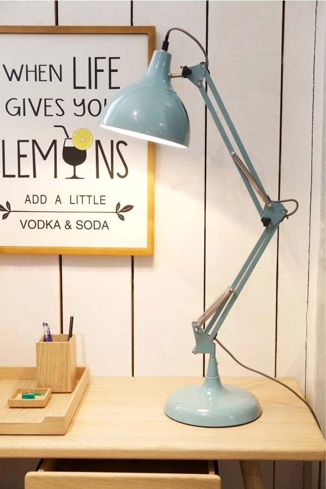 Desk Lamp Sky blue Traditional H75xW20xD20cm 1xE27 large screw bulb Grey fabric flex CL113 28535 Light up your office space with this delightful sky blue desk lamp. The lamp is traditional in style and shape with a contemporary colour twist and a grey fabric flex. The Desk Lamp requires one large E27 Edison screw bulb. Angle the light over your favourite reading corner or home office for stylish illumination.